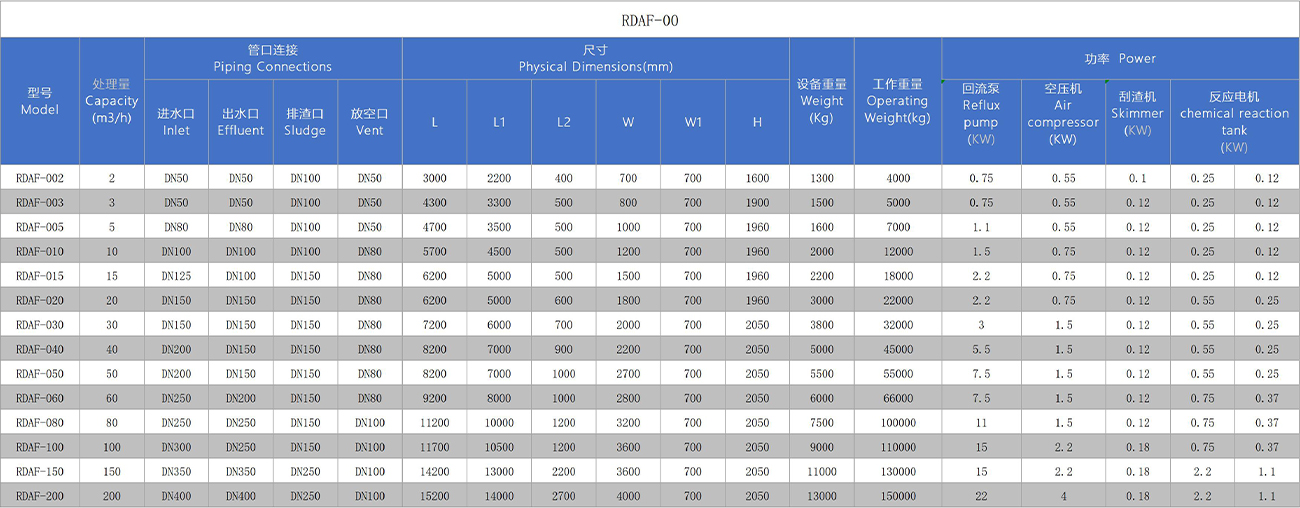Det behandlade avloppet tas som cirkulerande vatten genom en cirkulerande pump och kommer in i den upplösta lufttanken. Samtidigt tillsätts tryckluft till den upplösta lufttanken, och effektiv sodavattenblandning utförs i den upplösta lufttanken. Efter blandningen skickas det upplösta luftvatten som innehåller luft till kontaktområdet för luftflotation. Den omedelbara tryckfrisättningen genom releaser genererar ett stort antal mikrobubblor, som snabbt fästs vid det koagulerade suspenderade materialet. Densiteten för det suspenderade materialet är gradvis mindre än vattendensiteten och den flyter automatiskt till ytan. Vattnet längst ner i utrustningen lämnas i en hast, och det släpps ut till det rena vattenområdet genom vattenutloppsanordningen längst ner. En del av vattnet i det rena vattenområdet fortsätter att användas som cirkulerande vatten för utrustningen, och resten släpps ut till nästa process. Skummet som flyter mot ytan skrapas till skumpoolen av skrapan för ytterligare behandling.